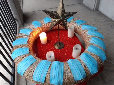 Als Gegenstück zum traditionellen Wichern-Adventkranz befindet sich auf der gegenüberliegenden Seite eine aktuelle Adventkranz-Installation. Der "Adventkranz 2020" erzählt von den besonderen Umständen, unter denen dieses Jahr die Adventzeit steht. Statt Kerzen trägt er Mund-Nasen-Schutzmasken! Dieser Kranz soll nachdenklich stimmen. Denn trotzdem brennt auch hier das Licht der Hoffnung!