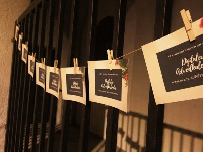 Entlang des Zaunes finden Sie Kärtchen zum Mitnehmen. Sie informieren über den Digitalen Adventkalender der Evangelischen Kirche in Wien. Genießen Sie jeden Abend im Advent eine online Andacht.
