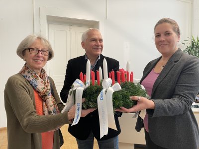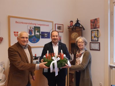 Ende November überreichten Pfarrer Hannes Pitters und Kuratorin Erna Huber einen solchen Original Adventkranz an Bezirksvorsteherin Christine Dubravac (Brigittenau) und Alexander Nikolai (Leopoldstadt.