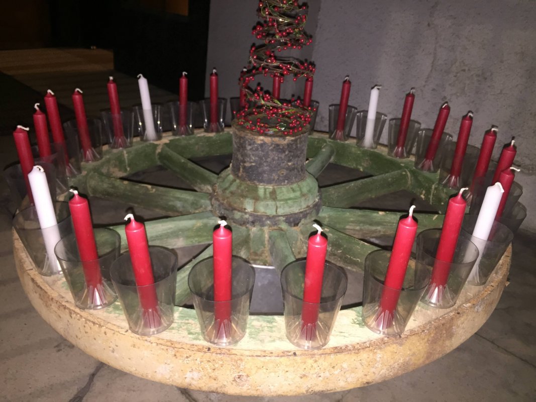 Der Adventkranz ist eine ursprünglich evangelische Erfindung aus dem 19. Jahrhundert. Dieser Tradition folgend, überreichen wir jedes Jahr einen Original - Adventkranz an die Bezirksvorsteher von Leopoldstadt und Brigittenau. Und auch vor dem Kircheneingang steht ein Wagenrad mit so vielen Kerzen, wie der Advent Tage hat.