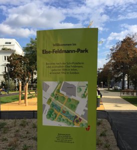 Der Park ist nach der österreichischen Schriftstellerin Else Feldmann benannt. Die Schriftstellerin und Journalistin wurde vom NS-Regime 1942 im Vernichtungslager Sobibor ermordet. Die Namensgebung soll verhindern, dass ihr Leben und Wirken in Vergessenheit gerät.