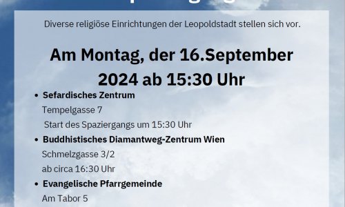 Addresse: VerklärungskircheAm Tabor 51020 WienMontag, 16 September 2024 - 3:30nachmittags bis 6:00nachmittags8. Interreligiöser Spaziergang